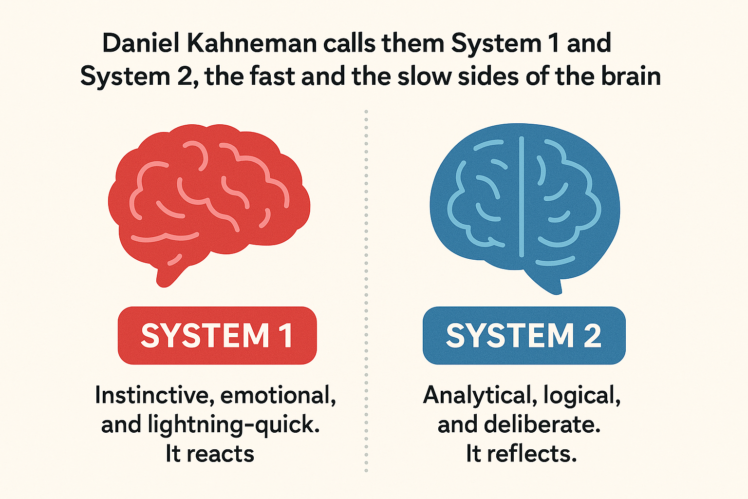 - System 1 is instinctive, emotional, and lightning-quick. It reacts.