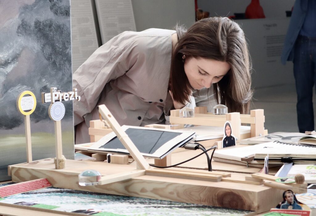 Prezi isn’t the focal point of the installation, but rather a part of the whole. It blends seamlessly with the drawings, lights, and handmade objects, creating an immersive, living presentation.