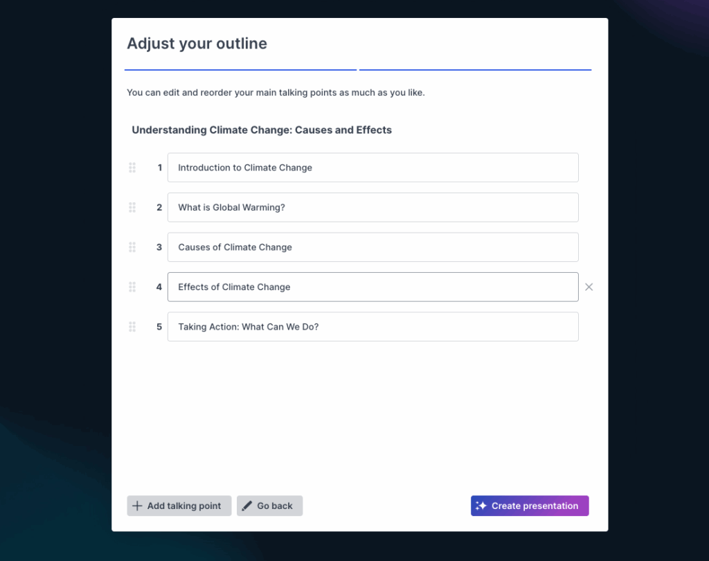 Now, you have even more control with the new editable outline feature. Before your presentation is generated, Prezi AI shows you an outline that you can fully customize, reorder sections, fine-tune language, or remove points you don’t need. It’s built to support educators who already have great materials but want to give them new life using AI. Whether you're starting from scratch or transforming past lessons, you’re always in the driver’s seat.