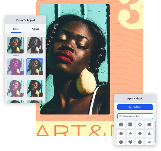 Enhance your designs with our simple tools to add filters, adjust contrast and brightness, mask objects, and more.
