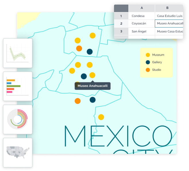 Visually explain complex ideas with charts and graphs of all kinds. Add geographic context by using your own map, or find what you need in our map library.