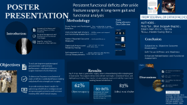 Transcript: Persistent functional deficits after ankle fracture surgery: A long-term gait and functional analysis POSTER PRESENTATION FROM JOURNAL OF ORTHOPAEDICS Tools: Comprehensive Data Collection AUTHORS : Methodology - Cross-sectional design, power analysis, inclusion/exclusion criteria Study Design and Participant Selection Firat Tan , Sibel Bozgeyik Bagdatli, Gizem Irem Kinikli , Semra Topuz ,Hande Guney Deniz Increasing Incidence and Clinical Impact of Ankle Fractures Fracture Classification & surgical Distribution Lateral malleolars Bimalleolars -two individual - seven individual -three individual Trimalleolars Instrumented Gait Analysis and Functional Assessment - GAITRite system, spatiotemporal parameters Introduction Surgical Management and Postoperative Functional Challenges Fracture Pattern Analysis - AOFAS and OMAS scales Patient-Reported Outcome Measures Denis-Weber Classification -Majority of participants (n=13) had Type B fractures, with only one classified as Type C. Lauge-Hansen Classification -Thirteen cases were identified as supination-external rotation injuries, and one as supination-adduction.. Conclusion Need for Long-Term Evaluation of Gait Deficits Functional and Clinical Assessment - Wilcoxon test, ICC, SEM, MDC, effect sizes Heel Rise Test – plantarflexor strength Weight-Bearing Lunge Test – ankle dorsiflexion mobility GAITRite System – spatiotemporal gait parameters AOFAS Ankle-Hindfoot Scale – patient-reported outcome Olerud-Molander Ankle Score (OMAS) – patient reported outcome Statistical Analysis and Reliability Testing Summary Table Finding Category Parameter Surgical Non-Surgical Ratio Deficit Gait Step Length 58.0 cm 55.7 cm 1.04:1 +4% Gait Double 0.3 s 0.4 s 0.75:1 -25% Function Heel Rise 9.7 cm 11.4 cm 0.85:1 -15% Function WBLT 4.0 cm 10.5 cm 0.38:1 -62% Function WBLT 6.5 cm 1.5 cm 4.3:1 +333% Subjective AOFAS 86.5/100 - 86.5% - Subjective OMAS 80/100 - 80% - - Calf circumference, Heel Rise Test, Weight-Bearing Lunge Test Anthropometric and Clinical Measurements Subjective vs. Objective Outcome Dissociation Soft Tissue Stiffness and Weakness Enhanced Rehabilitation and Functional Assessment Paradox Objective 62% 83% Gap: 21%- vs Subjective Objectives THANK YOU To evaluate long-term spatiotemporal gait parameters and functional performance in individuals following surgical treatment of ankle fractures. Results Gait Compensatory Strategies and Asymmetry Gastrocnemius-Soleus Complex Dysfunction Discussions Key findings :Even 4.5 years after surgery, patients showed lasting deficits despite good clinical scores. The surgical side had reduced heel-rise height, limited dorsiflexion, and slight gait asymmetry. These results indicate ongoing muscle and mobility impairments needing focused rehabilitation. To determine the presence and extent of residual deficits in ankle dorsiflexion mobility and plantarflexion strength post-surgery. Ankle Dorsiflexion Limitations and StiffnessC. 62% Clinical Scores vs. Functional Performance Gap 83% To provide evidence-based insights for optimizing rehabilitation strategies aimed at improving gait symmetry and functional recovery after ankle fracture surgery. 80-86% Objective capacity TEAM MEMBERS Subjective satisfaction Increase patients report 80-86% satisfaction despite having only 38-85% functional capacity KASHAF FATIMA (143) ALISHBA KHURRAM (140) DUA MEHBOOB(115) FATIMA AHMED (104) AYESHA BANO (126) Objective measurements 1- Gait Analysis 2- Double support time 3- Functional tests