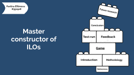 Transcript: Pavlina Eftimova i6351918 Future research Conclusion Test-run Feedback Master constructor of ILOs Game Introduction Methodology References UTQ program Master of ILOs game Biggs & Tang, 1999 Constructive alignment SOLO Bloom's What about writing ILOs? Ludodidactics-designing education and learning behavior based on gaming principles (Renger & Hoogendoorn, 2022). How can UTQ participants be more engaged in developing and critically analyzing ILOs as a foundation for constructive alignment? ✅ ✅ It was fun! Good discussions. Magic circle Learning from each-other. Realisation that ILOs are better when you formulating them together. Improve course and role descriptions Timer on the screen S1: Group all the roles separately S2: Give token before the start S3: Giving the purpose of the course to the visiting PD S4: Presentations and sharing ILOs at the end How can UTQ participants be more engaged in developing and critically analyzing ILOs as a foundation for constructive alignment? By participating in a game called "Master of ILOs" created with Ludodicatics 2. 1. Implication beyond the UTQ program The ILOs can be used for the constructive alignment game CPD 3. Future research on using gaming principles in university References Biggs, J. B., & Tang, C. (2011). Teaching for Quality Learning at University : What the Student Does (4th ed.). Mcgraw-Hill, Society for Research into Higher Education & Open University Press. (Original work published 1999) Bloom, B. S. (1956). Classifying Teaching Aims: The Cognitive Domain. Improving College and University Teaching, 4(4), 95–95. JSTOR . https://doi.org/10.2307/27561786 Krathwohl, D. R. (2002). A Revision of Bloom’s Taxonomy: An Overview. Theory into Practice, 41(4), 212–218. https://www.jstor.org/stable/1477405 Main, P. (2021, May 24). A teacher’s guide to SOLO Taxonomy. www.structural-Learning.com. https://www.structural-learning.com/post/what-is-solo-taxonomy Renger, W.-J., & Hoogendoorn, E. (2022). Ludodidactiek. Vansteenkiste, M., Soenens, B., & Ryan, R. M. (2023). Basic Psychological Needs Theory . 84-C4P292. https://doi.org/10.1093/oxfordhb/9780197600047.013.5