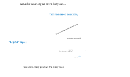 Transcript: Car Wash Presented by: Cassie Jones Project #1 Car Wash September 16, 2011 Materials you will need: 2 large buckets 2 thick sponges Car wash soap 4 towels Car wax Glass cleaner Hose Shady area (or time in the evening) Step One: Prepare the Car Move car to a shady area. Fill one bucket with water and car soap. Fill one bucket with plain water. Spray water over the car to loosen dirt. Step Two: Wash the Car Soak the entire sponge in soapy water. Wash the car by section beginning at the top. To minimize swirls, do not use a circular motion. Rinse sponge when it becomes dirty. When section is complete, rinse with a hose. Dry the entire car with a fresh towel. The Finishing Touches Use a squeegee to clean windows. For an extra shiny look, apply wax. Use chrome polish for your rims. Use a tire spray product for shiny tires. Helpful Tips Conserve water by not leaving the hose running. Do not use dish soap. It can strip the protective coating. Don't forget to shut all doors and windows. Consider washing an extra-dirty car twice. Use rubbing alcohol to remove water spots from mirrors.