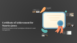 Transcript: Congratulations on achieving $25 million in assets under management, Maurice Jones! Congratulations Certificate of Achievement This certificate recognizes the remarkable achievement of accumulating $25 million in assets under management, reflecting dedication and excellence in financial stewardship. The design will feature a decorative border and an elegant layout to enhance its formal presentation and significance. $25 Million in Assets Under Management This accomplishment reflects outstanding financial management and growth, marking a significant milestone in the investment journey. The achievement not only highlights the trust clients place in our services but also sets a benchmark for future success. Presented to Maurice Jones This certificate proudly recognizes Maurice Jones for his exceptional accomplishment in achieving $25 million in assets under management. It highlights his dedication and success in the financial sector, serving as a testament to his hard work and commitment to excellence. Certificate of Achievement for Maurice Jones Celebrating Maurice Jones' prestigious milestone in asset management. Date of Achievement This slide displays the official date that marks the achievement of $25 million in assets under management, symbolizing a significant milestone in the financial journey of Maurice Jones. Signatures and Endorsements This slide will include designated areas for signatures and endorsements from key figures, which will enhance the certificate's authenticity and significance. Having these endorsements underscores the importance of the achievement and the recognition received by Maurice Jones.