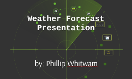 Transcript: Orange is Unhealthy for Sensitive Groups a radar tracking system using the Doppler effect to determine the location and velocity of a storm, clouds, precipitation, etc Precipitation Levels: 2013 by: Phillip Whitwam UV Index The End Doppler Radar shows what type of weather is coming in through shades between white and black Red is Unhealthy Green is good measurement of the strength of the ultraviolet radiation from the sun at a particular place on a particular day Weather Forecast Presentation Yellow is modernate Air Quality Our precipitation for the last 3 years has been extremely low compared to what we use to have. California's usual precipitation level is about 91.76 inches, but only December 31, 2013, Accuweather.com measured 2013's rainfall to be about 24.12 inches. That is a 67.64 inch difference in rainfall! the degree to which air is pollution free Infrared (IR) Radar Cooler colors are lighter whether, whereas warmer colors and also white are associated with heavy weather 0 is the lowest Exposure to UV rays and 15 the highest exposure to UV rays