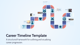Transcript: Steps to Create Your Career Timeline Follow these essential steps to craft a comprehensive career timeline that effectively captures your professional journey. Step 3: Choose a Visual Format Step 1: Gather Information Select a layout that best represents your timeline. Options include linear, circular, or infographics. Consider clarity and ease of understanding. Collect details about your education, work history, skills, and accomplishments. This foundation is crucial for building your timeline. Step 2: Organize Chronologically Sort the gathered information by date to ensure a logical flow. This helps in visualizing your career progression over time. Canva for Timelines Canva provides a user-friendly interface with customizable templates specifically designed for creating visual timelines, making it an excellent choice for both beginners and experienced users. Microsoft PowerPoint Templates Tools and Resources for Building a Career Timeline Diverse Examples of Career Timelines Microsoft PowerPoint offers various templates and design tools that allow users to create professional-looking timelines easily, suitable for presentations and reports. Research Best Practices Career timelines can take various forms, showcasing the professional journeys of both real individuals, such as famous entrepreneurs and athletes, as well as fictional characters in literature and film. These examples highlight the unique styles and storytelling techniques that can be employed to represent different career paths, making timelines an engaging way to visualize achievements and milestones. Online resources and articles provide best practices and tips for building effective career timelines, helping to ensure clarity, organization, and visual appeal. Work Experience Education Visual Representation of Growth A career timeline visually illustrates the journey through various roles, responsibilities, and milestones, making it easier to track progress and growth over time. Work experience highlights the positions held and responsibilities undertaken in various roles. This component emphasizes practical applications of skills and contributes to a person's professional identity and growth. Education is foundational, encompassing degrees, certifications, and relevant training that contribute to professional qualifications. It reflects the knowledge base and expertise gained over time, influencing career opportunities. Self-Reflection Tool Importance of a Career Timeline Reflecting on a career timeline allows individuals to assess their skills, strengths, and areas for improvement, promoting effective career planning. Enhances Job Applications Having a career timeline can significantly enhance job applications and interviews by providing a clear and organized presentation of one's professional history and accomplishments. Focus on Clarity and Conciseness Incorporate Visuals for Better Understanding Clarity and conciseness are essential for making your career timeline easily understandable. Avoid clutter and ensure each entry is straightforward. Incorporating visuals can significantly enhance the appeal and comprehension of your timeline. Use graphics, color coding, or icons to represent different career milestones effectively. Understanding the Career Timeline Conclusion and Next Steps Creating a career timeline is essential for personal and professional growth. A career timeline visually depicts the significant milestones, achievements, and experiences that define one's professional journey. It serves as a foundational tool for mapping career development and future aspirations. Present Having a career timeline allows for a clear overview of one’s professional journey and identifies areas for growth. Future Starting to build your own timeline can guide you in setting achievable career goals and tracking progress over time. Career Timeline Template A structured framework for outlining and visualizing career progression.