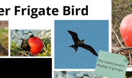 Transcript: -Courtship occurs between August and October -Males gather in groups and do a multitude of behaviors to attract females. -Females build while males gather -One egg is laid -Parental care differs between male and female Frigate Birds. -Only seabirds known on which sexes breed on cycles of different lengths BY: Krystal Romo & rachel Frei -Wing span allows them to stay flying for extended periods of time. -Little need for wing flapping. -Effortless flight allows for long distances to be covered with minimal energetic cost. -Mozambique Channel Study ( Henri et. al 2004) Info Sources Male vs Female - Large species of Sea Bird found across all tropical and subtropical oceans -Unable to to walk well; has short legs and very small feet causing awkward movement on land -Unable to swim, which directly affects its choice of diet - Their plumage lacks a waterproof coating -Color: Black, White, Brown, Red -Lifespan: 15-25 years -Wing span- 150cm - 250cm (59in - 98in) - Lifestyle: Colony -Male: entirely black plumage, glossed green on the head, with bare patch of skin on lower chest, known as the gular sac. -Can be inflated into bright red balloon-like an organ. -Female: larger than Male -white patch across breast and upper belly, entirely white head then black. -lacks gular sac, and has less glossy, brownish-black plummage Kingdom: Animalia Phylum: Chordata Class: Aves Order: Pelecaniformes Family: Fregatidae Genus: Fregata Threats Diet Fun Facts Habitat Habitat -Found in tropical oceans and coincides with the trade winds. -They breed on strands of mangroves on coral reefs, bushes on dry islands, and along coasts. *Man-O'War-Bird *Pirate Bird *Frigate Pelican Classification Magnificent FrigateBird (Fregata magnificens) Taxnomy Conservation -Relatively large population and is not currently considered to be globally threatened -As a result of human disturbance, habitat loss and the introduction of non-native predators, several historic colonies have been wiped out. -Losses have been most severe in the Caribbean, where an estimated 50 percent of the colonies have been destroyed. - There heavy reliance on food brought to the surface by underwater predators such as dolphin and tuna, which are themselves being driven to extinction, could have serious consequences for this species -Carnivorous -Airborne flying fish, squid, jellyfish, small sea turtles, tiny molluscs and scraps discarded by boats -Sometimes they harass other bird species -Kleptoparasitic Study (Vickery & Brooke 1994) -Their predators consist of cats, rats, and predominantly humans Who is this Bird? Image sources https://www.allaboutbirds.org/guide/Magnificent_Frigatebird/id http://tolweb.org/Fregatidae http://science.sciencemag.org/content/320/5884/1763http://www.arkive.org/magnificent-frigatebird/fregata-magnificens/ Vickery J. A, Brooke M. L. (1994) The Kleptoparasitic Interactions Between Great Frigatebirds and Masked Boobies on Henderson Island, South Pacific. The Condor 331-40. doi:10.2307/1369318 Weimerskirch H., Corre M., Jaquemet S. (2004) Foraging strategy of a top predator in tropical water: great frigate birds in the Mozambique Channel. Marine Ecology Progress Series. 297-308. doi:10.3354/meps275297 Breeding Behavior Biology -Many magnificent frigatebird colonies are protected by written laws, but rarely enforced. - There is a lack of funds, colonies are not patrolled -No method to punish those breaking the law -Improved protection and enforcement of existing laws, particularly in the Caribbean colonies, is therefore necessary to ensure the survival of this remarkable bird -Largest species of Frigate Bird -Frigatebirds are the only seabirds where the male and female look strikingly different -Charles Darwin dubbed this species “the condor of the ocean” http://www.mountainsoftravelphotos.com/Galapagos%20Islands/Day%202/slides/Galapagos%202-1-14%20North%20Seymour%20Young%20Frigatebird.html https://www.bing.com/images/search?q=frigate+birds&view=detailv2&&id=D2B0B91709CC1602784B0EA41211DC3B4ED2AC44&selectedIndex=8&ccid=GjORf4Yy&simid=608007687488799067&thid=OIP.M1a33917f8632db41187ea200832d183co0&ajaxhist=0 https://rollingharbour.com/tag/frigatebird-male/