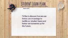 Transcript: I'd like to discuss how we can better use or savings to tackle our student loans and better set ourselves up for the future. Student Loan plan August, 2017 How much do we owe? $55,034 Spread across 3* loans Loan Breakdown $8,000 AES - STEVE $11,105 AES - Molly $35,259 Great Lakes - Steve Student Loan Breakdown 15% Total: $53,034 21% 64% Deep Dive Total loan breakdown: Arranged from Highest to Lowest Balance How does this affect us? How does this affect us? Ramifications of carrying this much debt. Effects of carrying a large amount of debt. 1. It's expensive. We need to change the way we think about debt. 2. It sabotages our retirement. 4. It affects our credit. 5. It affects Junior. 3. It holds us hostage. It costs us an estimated $6 per day to carry this much debt. What we know now about compounding interest should change our thoughts on how we handle retirement savings. This affects us financially and emotionally. Not that we want to be taking out more loans, but should the need arise, this is an issue. AKA "Apollo", "RAM", "Bruce", "George", etc At our current rate of repayment, we will continue to pay $700 of our income towards our student loan debt for the next 10+ years(year 2027). Our current debt is $55,034. The amount we will pay back by paying only the minimum payment is $69,050. Continuing at our current rate of repayment will cost us $14,016 in interest. Attacking this debt is the smartest way for us to build for our future. Currently, we $700 of our income goes towards our student loan debt. The recommended amount to save for retirement is 15% of your income. The future value of $700, assuming 6% return, in 30 years(retirement age) is $4,020. Using the same figures above, putting $700 per month into a retirement account, instead of towards a student loan, could grow to be $703,000. Alternatively, if we wait 10 years to begin contributing, that same amount would only grow to $323,000. The $700 we pay in student loans each month is roughly %15 of our budget. Our budget is currently very tight. Removing this large expense sooner would allow for more wiggle room. We wouldn't have to scrimp to afford things like a gym membership, a bigger house, or a boat. Kids are expensive. Having less debt, sooner, can't do anything but ease things for us, and Junior. It would make saving for things easier. Imagine how quickly we could save for a down payment on a car, or a vacation, if we had $700 extra per month. Having a smaller monthly "nut" allows for less stress if times are tight. What else could we do with $700 per month? The Debt to Income Ratio(DTI) is one way that lenders measure the ability of a customer to pay back a loan. Carrying more debt can affect your ability to get a loan, and can increase the interest rates available to you. Carrying as much debt as we do affects our debt to income ratio Having more debt affects Junior. At our current rate of repayment, and based on my estimate of when he'll arrive, we'll be paying back our student loan debt until he's in 4th grade. That makes things harder, like: Shopping for clothes at places other than Carter's Going to summer camp Playing sports, or other extracurricular activities Saving for college It's not just our future. Proposed Plan of Attack Proposed Payoff Plan Plan of Attack Payoff Timeline 9/1/2017 - 11/2021 9/1/2017 9/1/2017 5/1/2019 11/2027 5/1/2019 Make a lump sum payment of $8,000 to close AES loan(STEVE). Total loan balance will decrease from $55,034 to $47,034. We use the $90 per month that was going toward the closed loan and apply it to AES loan(Molly). New payment amount will be $300, up from $180. Estimated date we will reach the $5,000 force out threshold on AES loan(Molly). Paying off this loan at this date will bring our total loan balance to $26,834. We use the $300 per month that was going toward the closed loan and apply it to the Great lakes loans, while specifically targeting those with higher interest rates. The new payment towards these loans will be $700, up from $421. 11/2021 Estimated date at which we will have reached the $5k force out threshold of our last loan. Paying this off will close all of our student loans. 6 years before our current projected payoff date. Year that Steve will be 47, Molly will be 44. This is when we are now scheduled to pay off our loans. Student Loan Debt Plan of Attack Debt vs Time - Proposed Plan Expected Results How this approach will benefit us. The Good News! The benefits of paying our loans off are sooner are substantial. Just by paying the one time, lump sum payment of $8,000 to close our lowest loan, we will save $3,500 and pay off our loans 16 months earlier. The benefits of paying our loans off are sooner are substantial. If we take it one step further, and then apply the $90 payment that was previously going to the $8,000 loan, we begin to see more benefits. Following the plan I've outlined would: Pay off our loans 6 years earlier We would repay a total of $59,000 instead of $69,050,