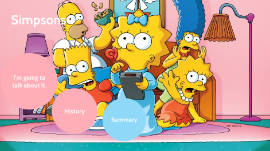 Transcript: Simpsons I'm going to talk about it. History Summery History The Simpsons are a family with problems and who lives in Springfield.This series is a series of funny and difficult moments for them. There are five main characters in the show : Homer Simpson Marge Simpson Lisa Simpson Bart Simpson Maggie Simpson There are a lot of side characters in the show. They have one cat and one dog. Summary Homer Jay Simpson is Marge's pure husband and father of Bart, Lisa and Maggie Simpson. Homer works as a low-level safety inspector at the Springfield Nuclear Power Plant in Sector 7G. He likes donuts a lot. He is very lazy, he always sleeps at work. Homer Simpson Homer Simpson Marge is the mom of the Simpson family. With her husband Homer, she has three children: Bart, Lisa, and Maggie. She is housewife. She always smile. Marge Simpson Marge Simpson Bart is the rebellious, ridiculous, misunderstood, disruptive and "potentially dangerous" eldest child. He is the only son of Homer and Marge Simpson, and the older brother of Lisa and Maggie. Bart doesn't like school. He is always punished by his teachers and his family. Bart Simpson Bart Simpson Lisa Simpson, at the age of eight years old, is the second child of Homer and Marge, the younger sister of Bart, and the older sister of Maggie. She is the smartest member in the family. She likes studying something . She plays saxophone. Lisa Simpson Lisa Simpson Margaret Evelyn "Maggie" Simpson is a youngest, child of Marge and Homer, and the baby sister to Bart and Lisa. She is often seen sucking on her pacifier, and, when she walks, she step on over her clothing and falls on her face. She always wear blue dress. She has a teddy bear. Maggie Simpson Maggie Simpson