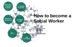 Transcript: How to become a Social Worker By Christian Wilson & Bianca Villavicencio Responsible for helping individuals, families, and groups to help with cope with problems there facing. Work in mental health clinics, schools, child welfare and human service agencies, hospitals and private practices. Job Description Job Description Work Cited https://www.bls.gov/ooh/community-and-social-service/mobile/social-workers.htm https://mswonlineprograms.org/job-duties-and-responsibilities-of-social-workers/ Hard and Soft skills Active listening Organization Critical thinking Setting Boundaries Communication Empathy Emotional intelligence Required Skills Skills https://socialwork.simmons.edu/skills-required-social-worker/ Work Cited https://msw.usc.edu/mswusc-blog/10-skills-every-social-worker-needs/ pictures Degree Field (major): social work psychology sociology Degree Level: Bachelors degree some positions require Masters degree Licensure & Certifications: some form of licensure required in all states voluntary certification available through National Association of Social Workers *must complete 30 hours of pre-service training to begin volunteering* Educational Background/ Experience Education/ Experience https://study.com/what_does_it_take_to_become_a_social_worker.html Work Cited https://www.socialworkdegreecenter.com/10-places-volunteer-youre-interested-career-social-work/ Bachelor lever: Social Worker Degree (BSW) Master Level: Master degree in social work (MSW) Advance Generalist: MSW with two years of non-clinical supervised social work experience . Specific Certification Certifications/ Graduate Programs https://www.socialworkguide.org Job allows you to impact people lives Diversity of work males everyday different Work in a safe and comfortable environment They have access to a lot of benefits because of there job Pros Pros and Cons Carry a high caseload Face the same risk as police officers in specific situations Schedule is often irregular Cons https://vittana.org/15-pros-and-cons-of-being-a-social-worker Simmons University University of Denver Baylor University Capella University University of Kentucky college of Social Work Graduate Programs Univeristy of Michigan-- Ann Arbor Washington Univeristy in St. Louis Colombia Univeristy 3 College / University Programs for Social Work University Programs https://www.usnews.com/best-graduate-schools/top-health-schools/social-work-rankings Work Cited Work Cited Earn degree from CSWE accredited program Apply for Licensure Take the national ASWB exam Pre-reqs/ Exams for programs Pre-reqs/Exams https://www.mswguide.org/licensure/ Work Cited Work Cited
