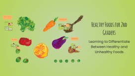 Transcript: Introduction to Healthy Foods Identifying Healthy Foods What are Healthy Foods? Healthy foods are those that are rich in nutrients, vitamins, and minerals. They include fruits, vegetables, whole grains, and lean proteins that support overall health and well-being. Fruits and Vegetables Whole Grains Fruits and vegetables are packed with vitamins, minerals, and fiber. They help strengthen the immune system and lower the risk of diseases. Aim for a variety of colors to maximize nutrients. Whole grains contain all parts of the grain kernel, providing important nutrients like fiber, B vitamins, and antioxidants. They help in digestion and provide lasting energy. Lean Proteins Importance of Healthy Eating Dairy Options Healthy Foods for 2nd Graders Lean proteins like chicken, turkey, fish, beans, and nuts are important for muscle growth and repair. They are lower in saturated fats compared to red meat, making them healthier options. Dairy products such as milk, yogurt, and cheese provide calcium and vitamin D, essential for strong bones and teeth. Low-fat and fat-free options are healthier choices for kids. Healthy eating is important for growth and development in children. It boosts energy, improves mood, and supports learning in school. Making healthy choices also sets the foundation for lifelong habits. Making Healthy Choices Identifying Unhealthy Foods Sugary Snacks Sugary snacks, such as candies and cookies, contain high levels of sugar and provide little nutritional value. Consuming these often can lead to health problems like obesity and cavities. Tips for Choosing Healthy Foods Choose foods with bright colors like fruits and vegetables, which are often packed with vitamins. Look for options that are low in added sugars and saturated fats, such as whole grain bread and lean meats. Fast Foods Processed Foods Fast foods, like hamburgers and fries, are often high in unhealthy fats, sugars, and calories. Eating these reqularly can contribute to weight gain and increase the risk of diseases. Processed foods, which include items like frozen meals and packaged snacks, are often loaded with preservatives and unhealthy ingredients. These foods can disrupt nutrition and overall health. Fun Healthy Recipes Learning to Differentiate Between Healthy and Unhealthy Foods Engaging in Healthy Habits Sugary Drinks Participate in regular physical activities such as biking or playing sports, paired with healthy eating. Healthy habits are not only about food but also staying active and getting enough sleep. Incorporate healthy ingredients into fun recipes like fruit smoothies or veggie wraps. Meal preparation can become enjoyable, fostering a love for cooking and healthy eating. Sugary drinks, such as sodas and fruit punches, contain high levels of sugar and little to no nutritional value. They can lead to weight gain and dental problems among children.