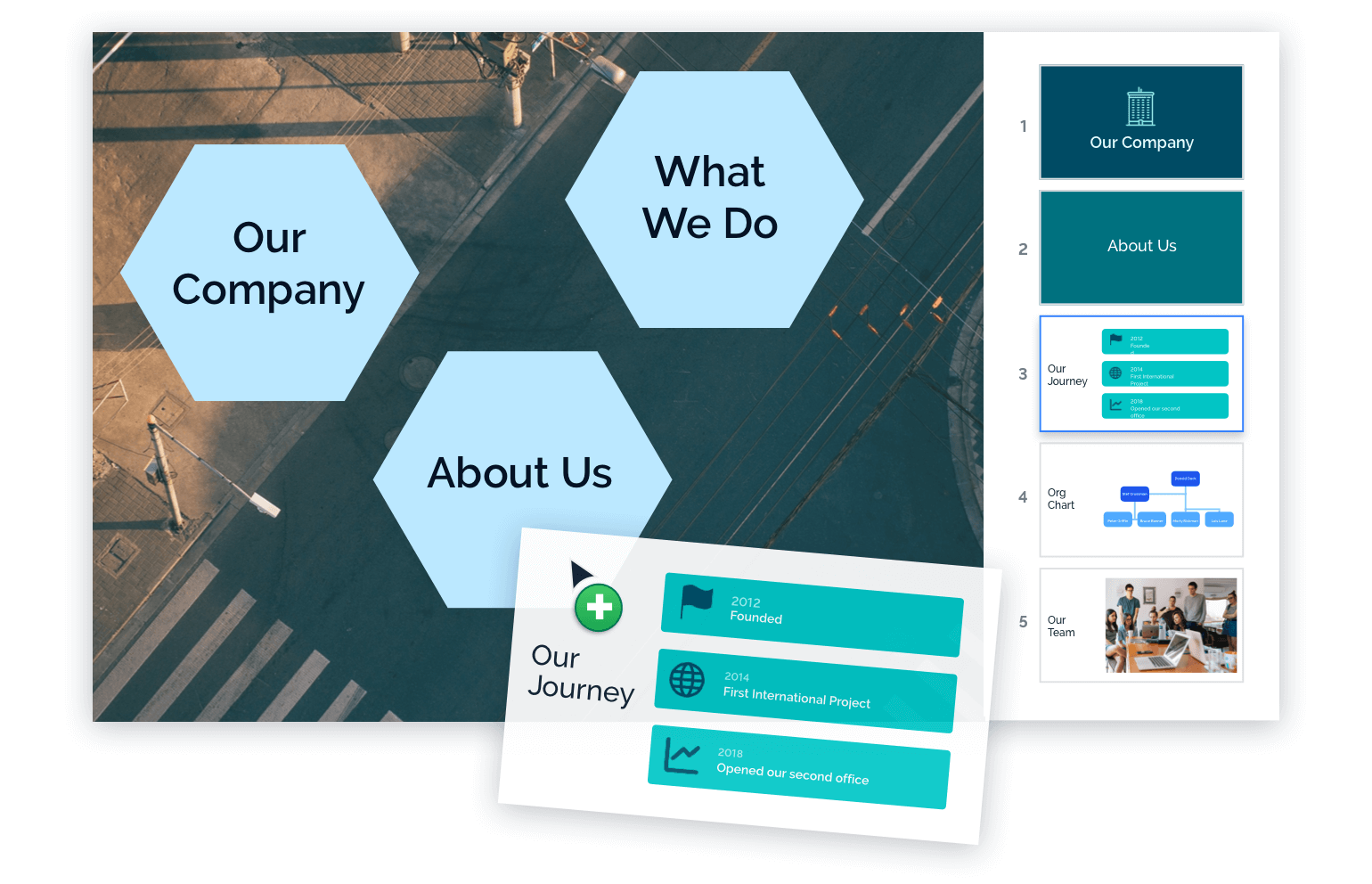 Save time and effort with our pre-designed presentation “building blocks” in lots of useful formats. Just drag, drop, and customize.