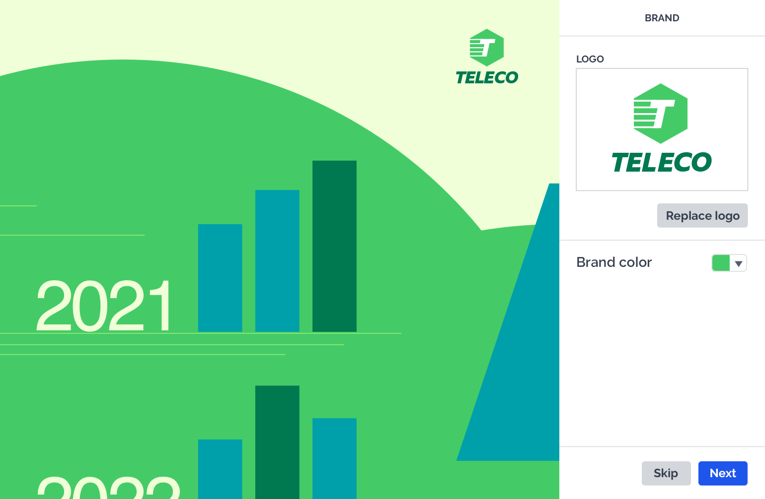 Need to match your company's color? Add your logo and let our “smart branding” function create a spot-on color theme for all your presentations.