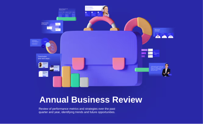 分析績效指標和策略,進行穩健的業務發展審查。透過醒目的視覺效果、圖表和清晰的要點,預測未來趨勢。